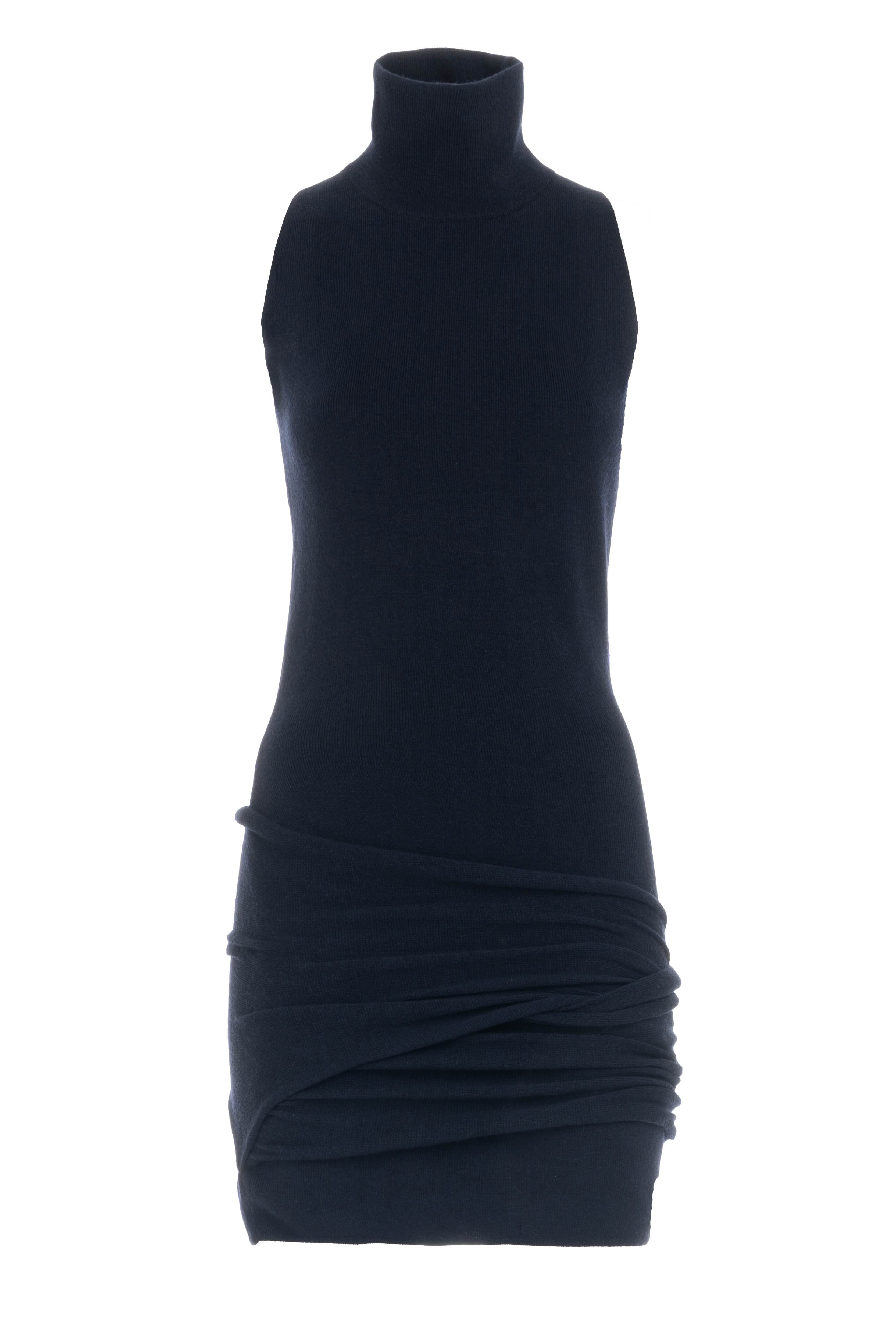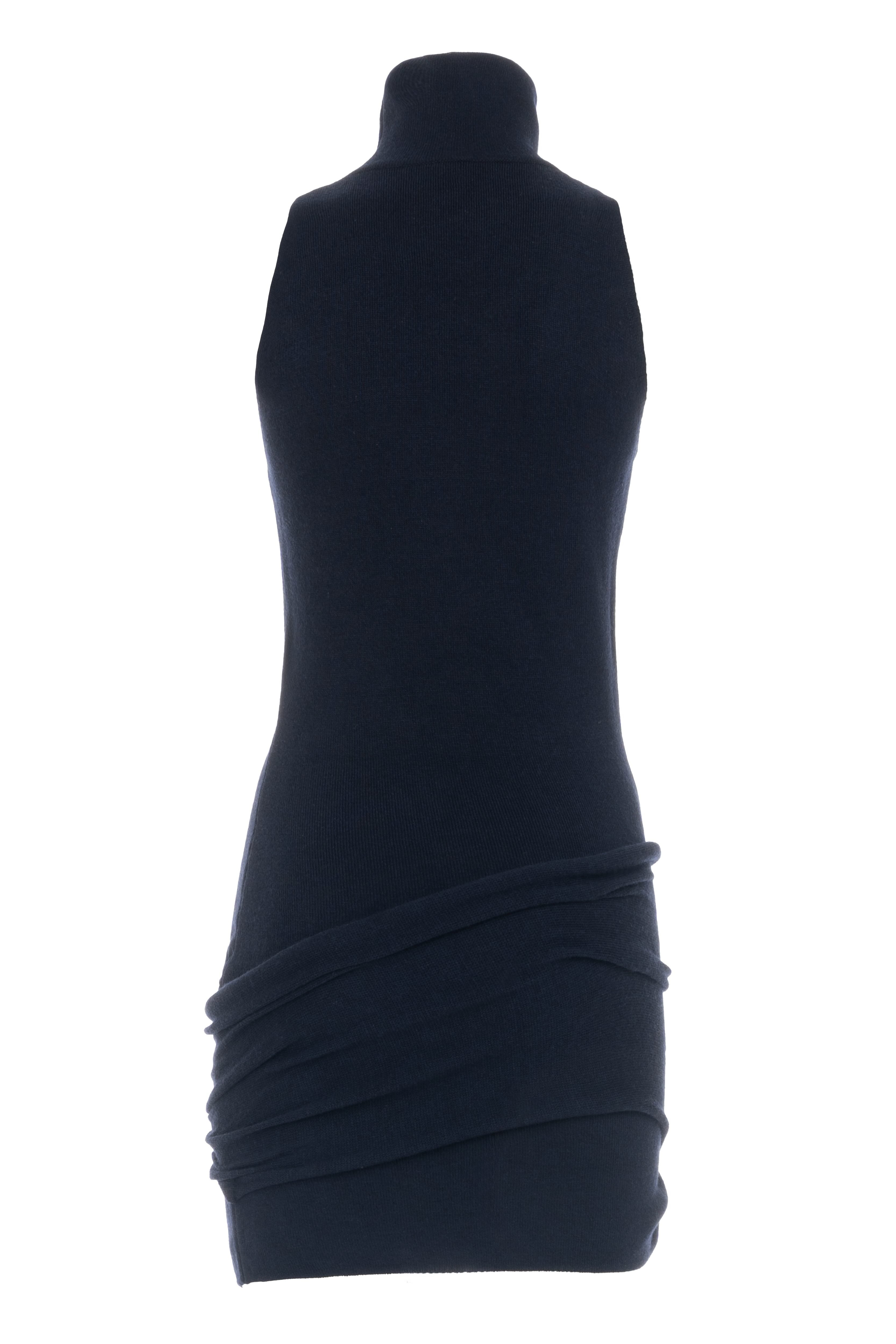 Mini dress in maglia con collo alto, smanicato e drappeggio incrociato frontale.
