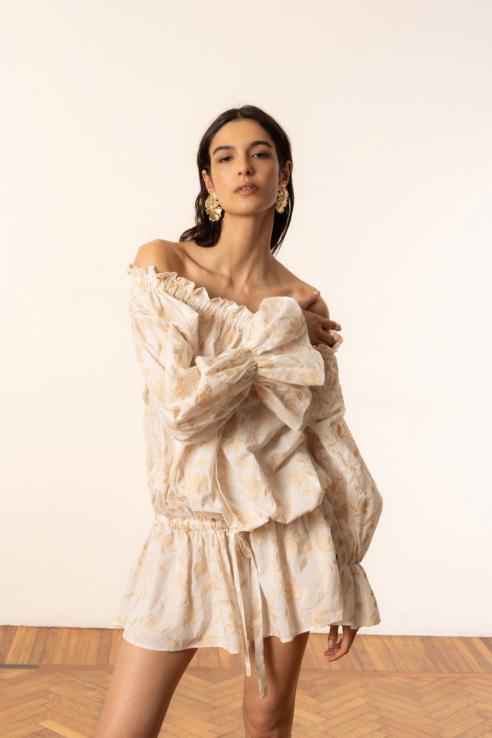 Embroidered cotton mini dress with long puff sleeves, boat neckline and drawstring at the sides.